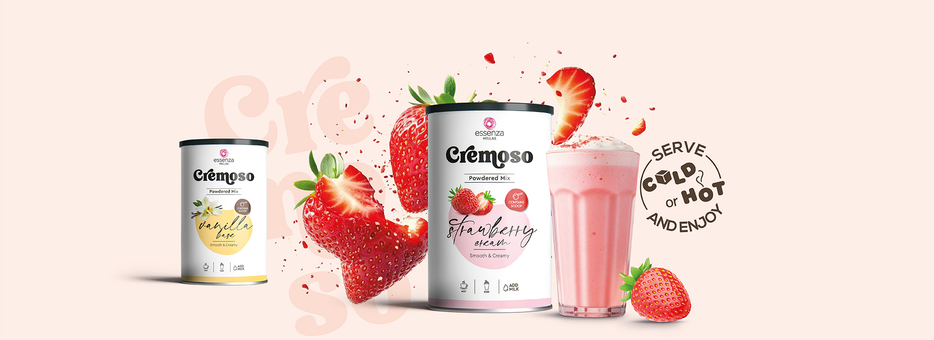 Η Essenza Hellas ανέθεσε στη Food For Thought τον σχεδιασμό της νέας σειράς Cremoso Powdered Mix, μιας πλήρους γκάμας μειγμάτων σε μορφή σκόνης για επαγγελματίες του coffee και bar industry, που περιλαμβάνει βάσεις για smoothies, coffee-based ροφήματα (frappes), φρουτώδεις επιλογές και λύσεις για milkshakes, κατάλληλες για ζεστές και κρύες παρασκευές.